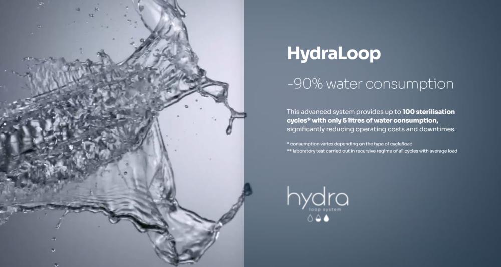 Sistemul avansat HydraLoop permite realizarea a pana la 100 de cicluri de sterilizare cu doar 5 litri de apa, reducand semnificativ costurile operationale si timpii de nefunctionare.