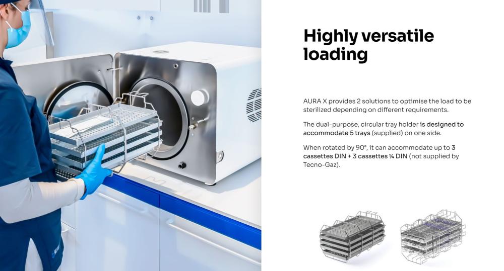 Aura X ofera doua solutii pentru optimizarea incarcarii, in functie de cerintele sterilizarii. Suportul dublu, circular, este proiectat sa sustina 5 tavi (incluse in pachet) pe o parte.